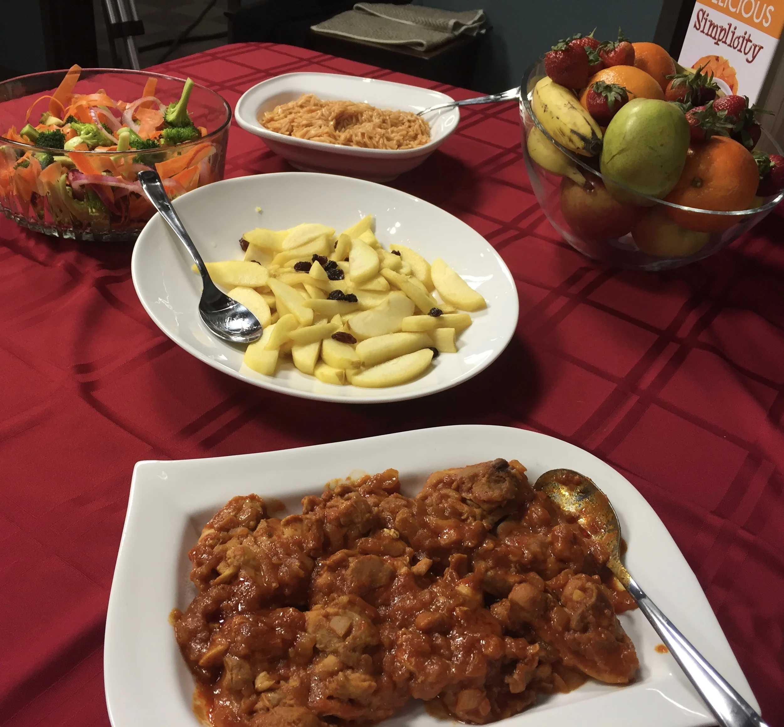 Pictured: Tex-Mex Chicken, Caramelized Apple slices with ginger, Carrot Curls and Broccoli Salad and Orzo Pasta Side.